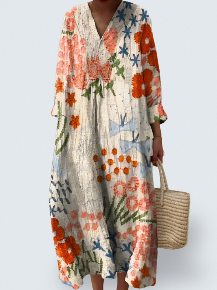 But what truly makes this dress bloom is its artistic print — a hand-painted mix of coral poppies, sky-blue petals, and leafy green stems scattered across a cream background. It's vibrant without being loud, delicate yet expressive — a visual bouquet that brings joy wherever you wear it.