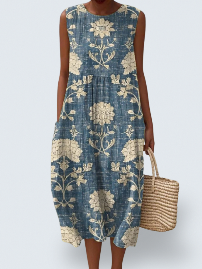 Introducing the Lyanne – Vintage Bloom Sleeveless Dress, where old-world charm and modern comfort meet in perfect harmony. With its elegant floral damask pattern printed on a soft, denim-toned backdrop, Lyanne is your invitation to slow down, soak in the sunshine, and dress with grace.